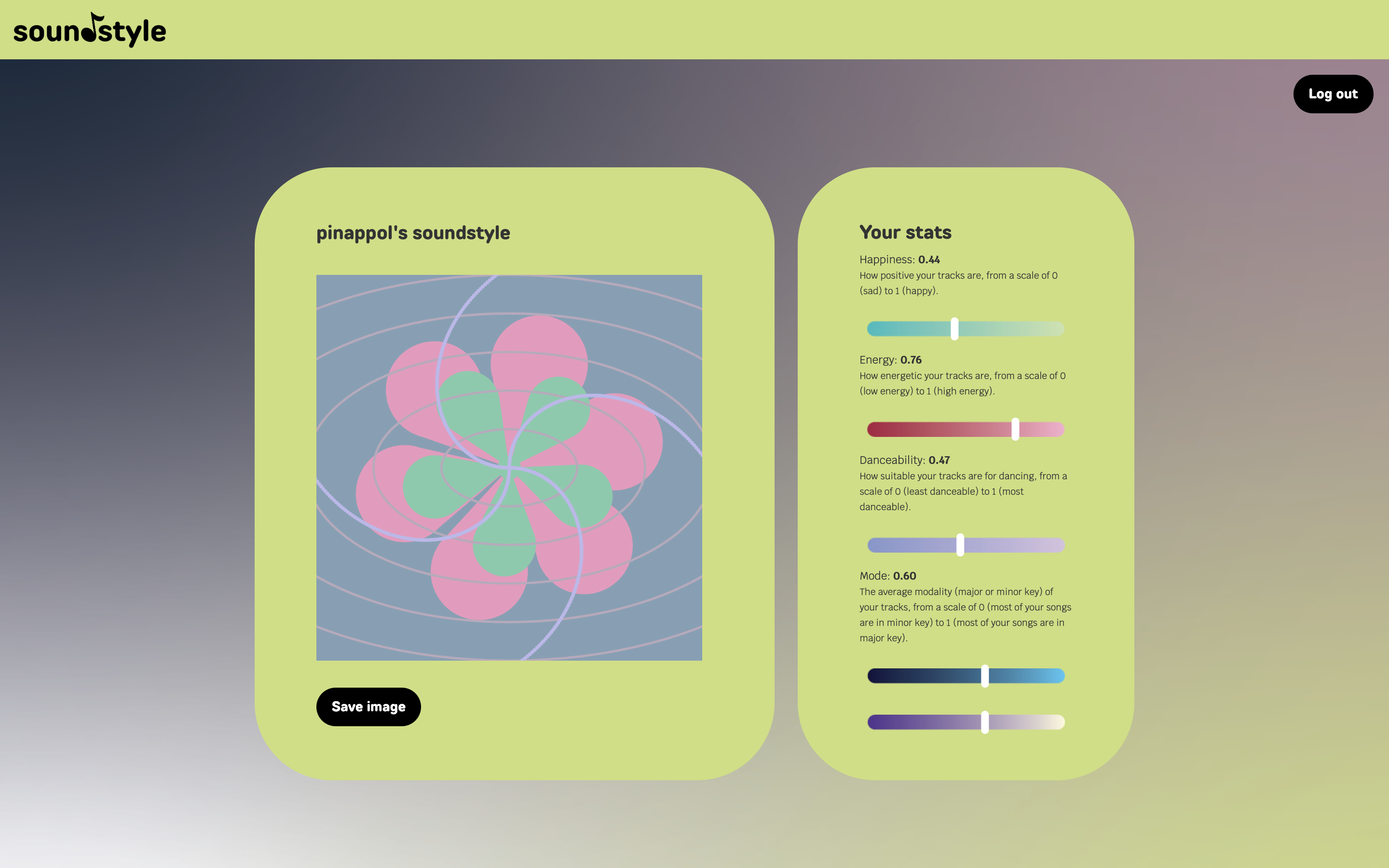 Have you ever wished you could make friends based on your music taste? Inspired by my love of music and the many friendships I've made through shared music tastes, Soundstyle was a website that used live data from Spotify and p5.js code to generate a visualisation of the user’s music taste through a flower. These visualisations were made into badges, which can be worn by users to showcase and identify others with similar music tastes.
